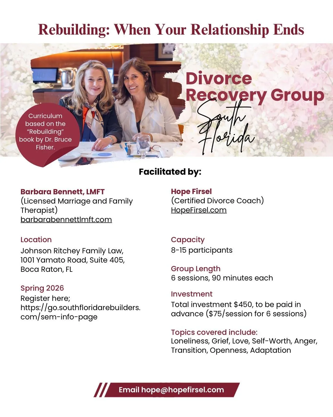 Divorce can be an isolating experience—this group provides a sense of community, support, and meaningful connection navigating this challenging time.